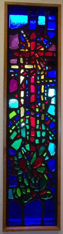 3. Crucifixion Window - Three crosses. The Cross of Christ is red. The crown of Thorns, and great drops of blood onto green leaves for Jesus' agony in Gethsemane. Green is also the color for life. By the Blood of Christ, we are given life.