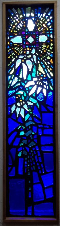 4. Resurrection Window - A traditional symbol for the resurrection is the cross adorned with jewels and looking radiant. The cross is now white. There is no more need for the shedding of blood. Easter Lilies are pushing up through the blue color. Blue is the color for heaven. Life on earth and life in heaven are God's gifts through Christ's resurrection.