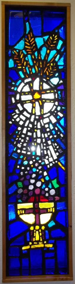 7. Holy Communion is a means of grace. Stalks of wheat and bread, the kernel of wheat surrounded by four touches of red breaks and falls down as "manna". (Also read, John 12:24-26). The grapes of the new wine fall into the chalice as His blod, which is "poured out for many".